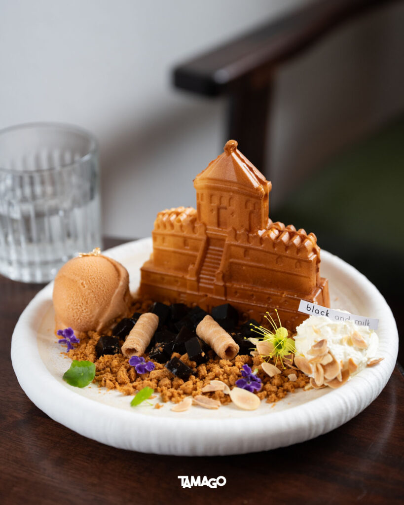 และ Golden Phra Sumen จานนี้เป็นของหวานที่ใส่ความเป็นไทยเต็มที่ ตั้งแต่แพนเค้กทรงป้อมพระสุเมรุ ที่ถอดแบบมาเป๊ะๆ สื่อถึงเอกลักษณ์ของ Black and milk สาขาใหม่ได้ดีและเป็นที่น่าจดจำ เสิร์ฟพร้อมไอศกรีมชาไทย รสชาติขวัญใจคนทั้งโลก เฉาก๊วยเนื้อเด้ง วิปครีม และเพิ่มสัมผัสกรุบกรอบด้วยทองม้วนหอมๆ กับคาราเมลครัมเบิล