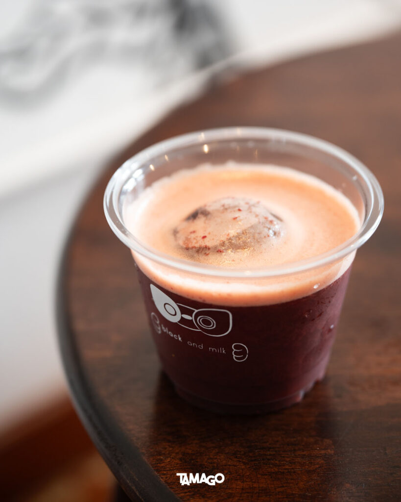 แก้วถัดมา Blood Diamond ซิกเนเจอร์สายกาแฟดำที่ทั้งสีและรสชาติจำลองจากไวน์แดง โดยผสมกาแฟกับมิกซ์เบอร์รี กลิ่นหอมหวานธรรมชาติ ดื่มแล้วสดชื่นแม้จะติดความขมนิดๆ และ BAM 02 ซิกเนเจอร์สายกาแฟนมที่ผสมผสานกลิ่นกับรสชาติส้มสด ได้ทั้งความครีมมี ความซิตรัส ความนัว กลมกล่อม เป็นเครื่องดื่มที่สดชื่นมาก เหมาะกับยามบ่ายอากาศร้อนๆ