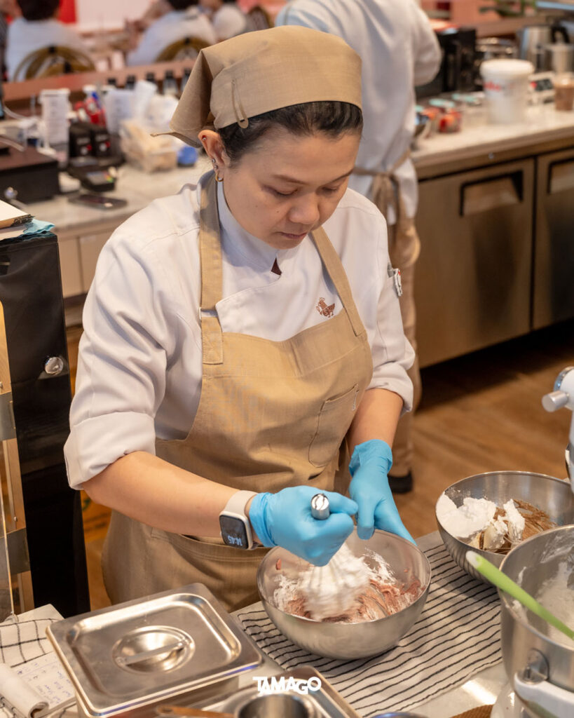 เชฟไก่เล่าว่า ขั้นตอนการทำซูเฟล่จะต้องใช้เวลาราว 20 นาทีต่อรอบ ทำเสร็จแล้วควรกินทันที และไม่แนะนำให้เก็บหรือทิ้งไว้ก่อนเพื่อรอกินภายหลัง บริเวณร้านจึงเป็นครัวเปิดที่เผยให้เห็นทุกกระบวนการ ตั้งแต่ตอนผสมแป้ง ตีแป้ง ไปจนถึงตอนจัดเสิร์ฟบนถาด ทำให้ขณะรอขนมอบ เราจะได้กลิ่นหอมๆ ของส่วนผสมที่กำลังคุกรุ่นในเตาด้วยความพิถีพิถัน
