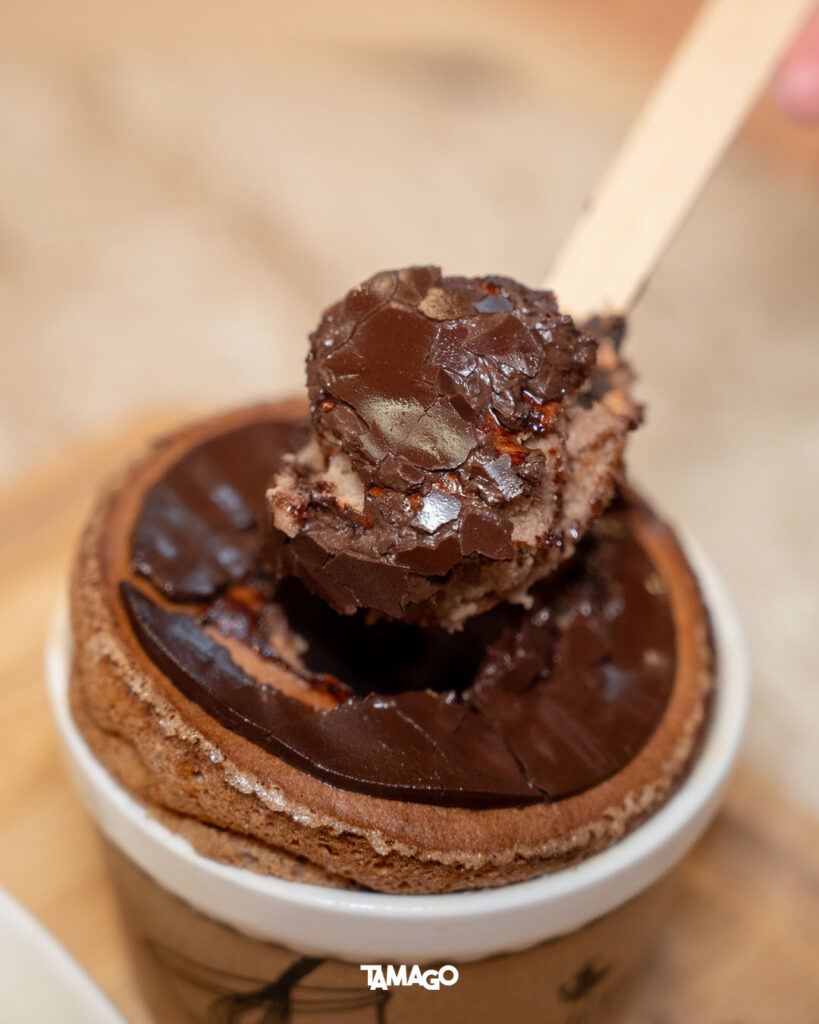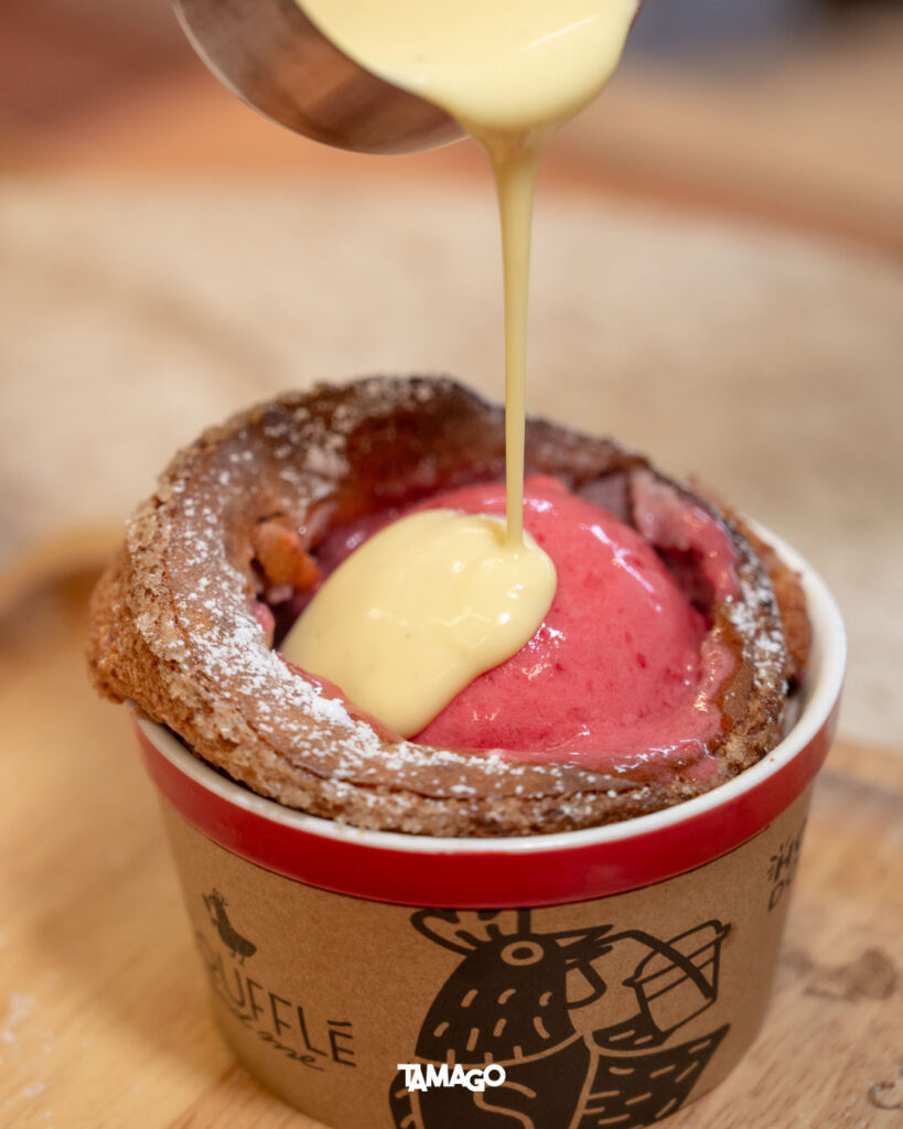 ทั้งนี้เชฟยังอยากให้ทุกคนสนุกสนานกับการกินซูเฟล่ จึงนำเสนอวิธีเติมเต็มประสบการณ์เย้ายวนใจไว้ด้วย เริ่มจากเจาะรูตรงกลางซูเฟล่ นอกจากจะช่วยกระตุ้นการดมกลิ่นทำให้อยากกินมากขึ้น ยังช่วยคลายความร้อนของขนม จากนั้นค่อยราดซอสหรือไอศกรีมลงไป จะตักกินพร้อมกันเป็นคอมมิเนชั่นหวานเย็นปะทะความอุ่น หรือรอให้ไอศกรีมละลายสักนิด ก็อร่อยเหมือนกัน