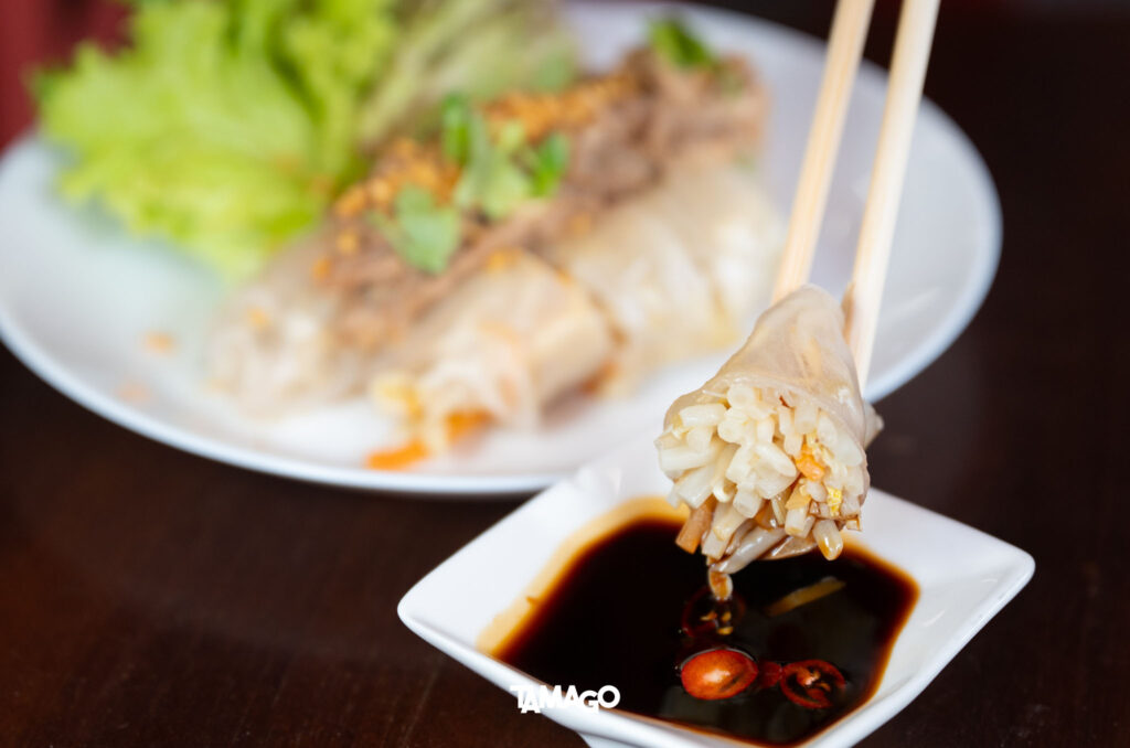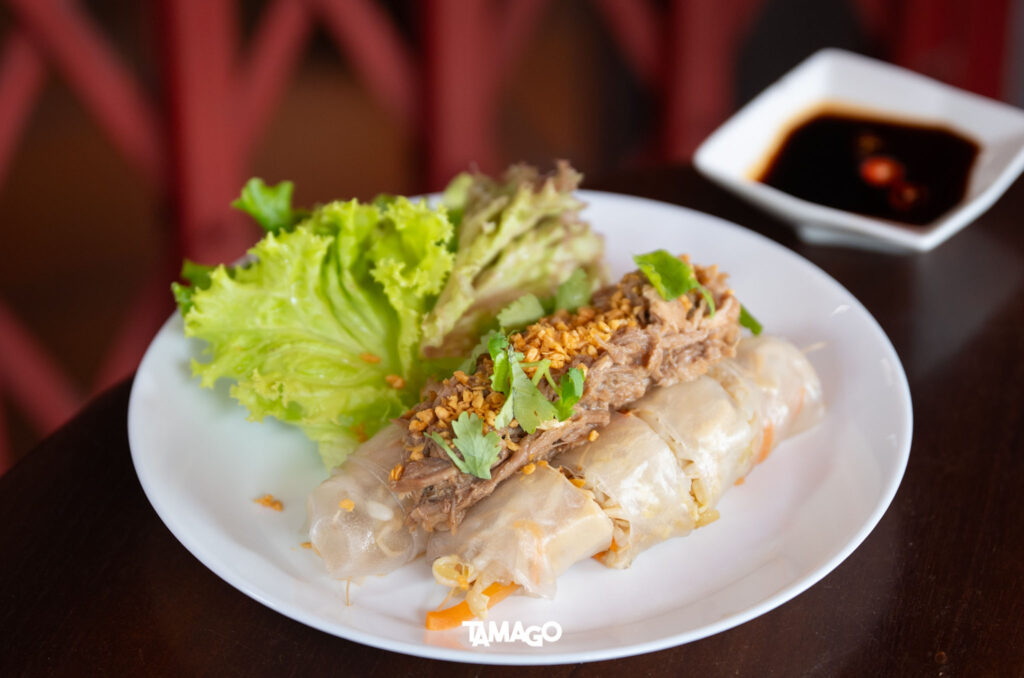 และ ก๋วยเตี๋ยวหลอดหมูตุ๋น ก๋วยเตี๋ยวหลอดจากใบเมี่ยง (หรือแผ่นแป้งเวียดนาม) ซึ่งมีปริมาณแป้งน้อยและไม่มีสารกันบูด ห่อไส้ผักรวมหลากหลายชนิด ด้านบนเป็นหมูตุ๋นในซอสน้ำส้มสายชูดำซึ่งผ่านการหมักบ่มแบบมีโปรไบโอติกส์ที่ดีต่อลำไส้ นำมาฉีกเป็นเส้นให้กินง่าย เสิร์ฟคู่น้ำจิ้มรสจัดจ้าน