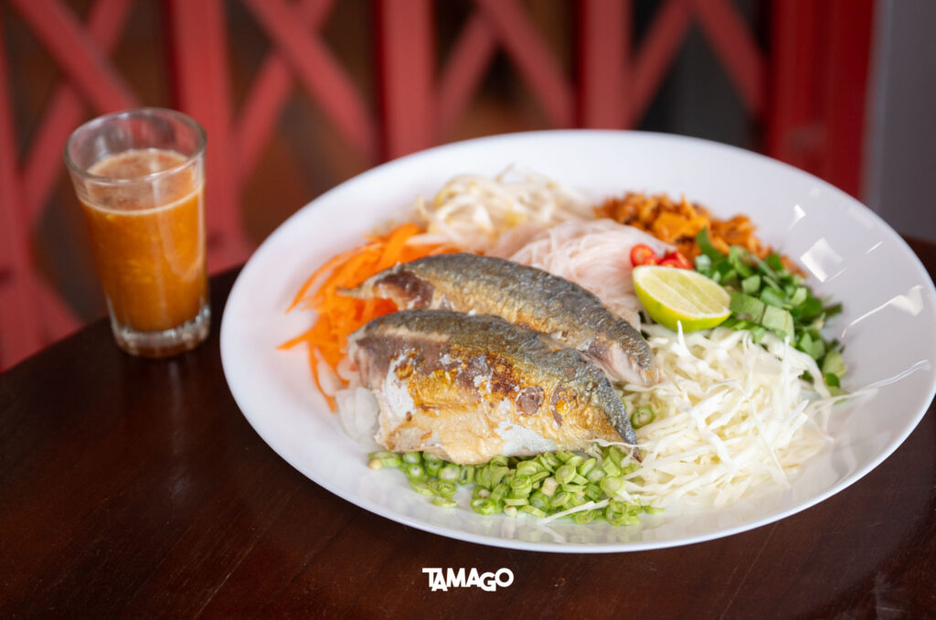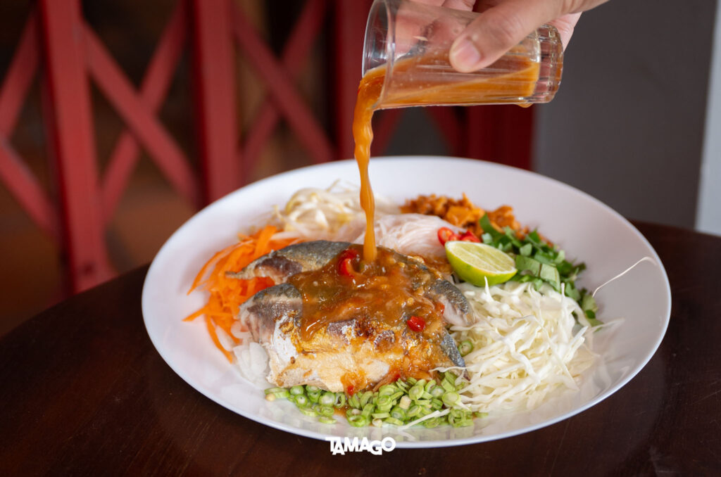 เมนูแนะนำแรกคือ ขนมจีนน้ำยำนัตโตะน้ำพริกน้ำย้อย เชฟนายให้นิยามจานนี้ว่า “อาหารไทยสไตล์เมดิเตอเรเนียน” เพราะมีวัตถุดิบมากประโยชน์หลากหลายในจานเดียว อย่างขนมจีนข้าวกล้อง ซึ่งเป็นธัญพืชไม่ขัดสี และเนื้อปลาทูไทย ที่มีโปรตีนกับโอเมกา 3 สูงเทียบเท่าปลาทะเลนำเข้าบางชนิด จัดจานข้างเคียงกับผักอีกมากมาย
