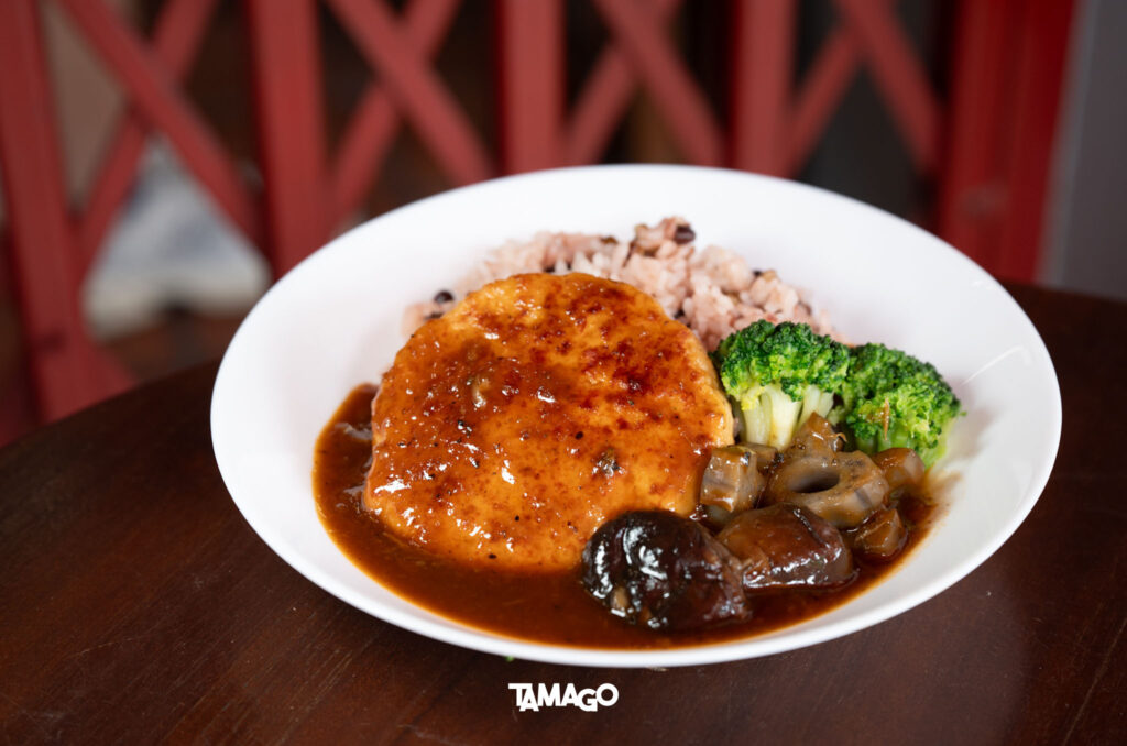 ถัดมาก็จัดหนักเรื่องโปรตีนอีกหน่อย ข้าวธัญพืชแฮมเบิร์กซอสกุ๊กชอป เชฟเลือกใช้เนื้ออกไก่สับมาทำแฮมเบิร์ก ปรุงอย่างพิถีพิถันจนทำให้แฮมเบิร์กนุ่มนวล ไม่แข็งกระด้าง เสิร์ฟพร้อมข้าว กข43 หุงรวมกับธัญพืช ถั่วเขียว และถั่วแดง ช่วยเพิ่มใยอาหารและมีสารต้านอนุมูลอิสระอยู่สูงด้วย