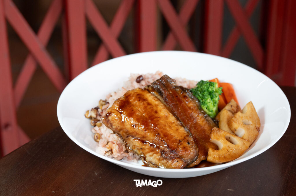 มาต่อกับอาหารจานข้าว ข้าวธัญพืชปลาดุกย่างซอสเทอริยากิโคโคนัทอะมิโน เมนูนี้มีกลิ่นอายความเป็นญี่ปุ่น แต่เชฟเลือกใช้เนื้อปลาดุกไทย ซึ่งอุดมด้วยโอเมก้า 3 นำมาผ่านกระบวนการทำความสะอาดอย่างดี แล่เลาะก้างแล้วย่างให้สุกหอม จากนั้นทาซอสเทอริยากิสูตรเฉพาะของทางร้าน ซึ่งเติมโคโคนัทอะมิโนเพื่อเพิ่มกรดอะมิโนที่ดีต่อร่างกาย เสิร์ฟกับข้าวธัญพืชและผักย่าง