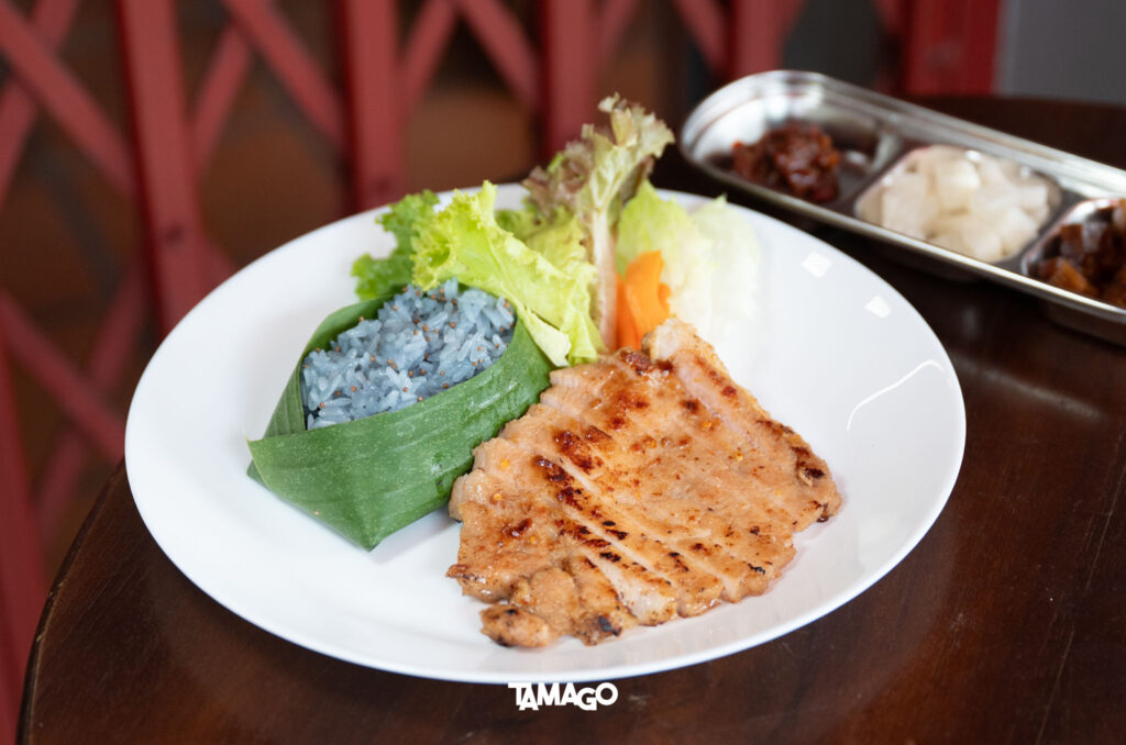 เมนูทางเลือกของคนเลิฟของปิ้งย่างและอยากสุขภาพดี ต้องเลือก ข้าวเหนียวสมุนไพรหมูย่าง ที่นี่ใช้เนื้อหมูสันนอก มันน้อยอร่อยหนัก หมักด้วยซอสสูตรพิเศษและย่างด้วยกรรมวิธีเฉพาะเพื่อลดการเกิดสารก่อมะเร็ง ในจานจะเสิร์ฟคู่ข้าวเหนียวอัญชัน ข้าวเหนียวดอกคำฝอยผสมงาขี้ม้อน หรือข้าวเหนียวก่ำ