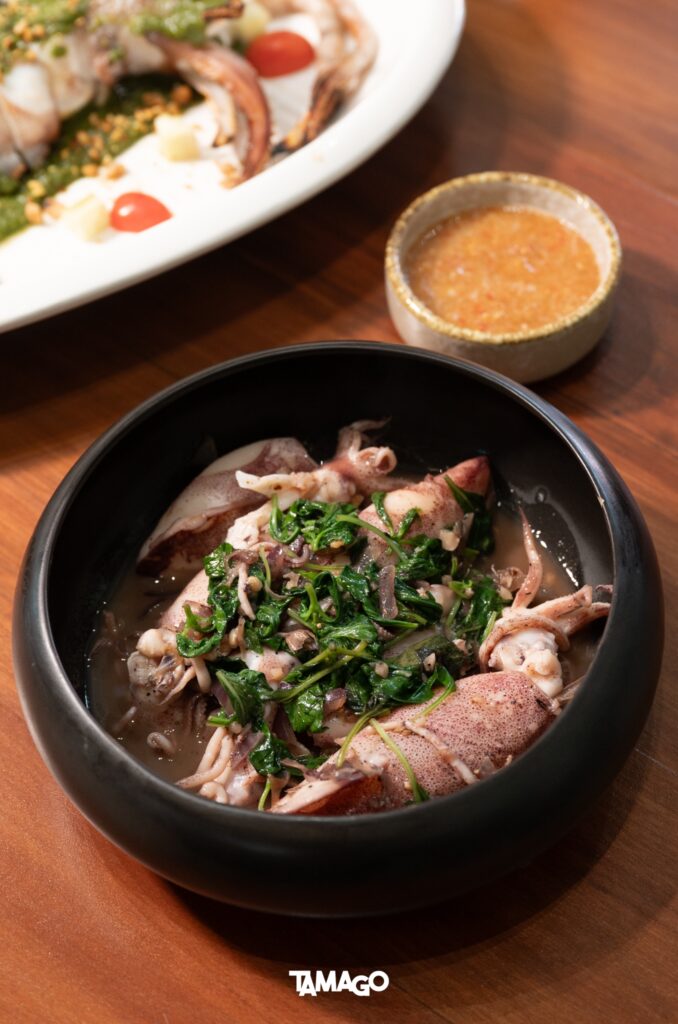 ต่อด้วย หมึกย่างซอสเพสซี่ ที่เสิร์ฟมาไซส์เต็มคำ เนื้อหมึกเด้ง ราดด้วยซอสเพสซี่เข้มข้น หอมกลิ่นเครื่องเทศและสมุนไพร เข้ากันอย่างลงตัว