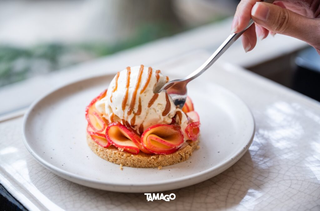 และอีกเมนูที่ไม่พูดถึงไม่ได้ Apple Ice Cream Pie แอปเปิลสดหั่นชิ้น ผัดกับเนยจนหอม วางบนฐานบิสกิตบด ท็อปด้วยไอศกรีมเย็นๆ รสชาติกลมกล่อม เรียบง่าย แต่ชวนให้คิดถึงของหวานโฮมเมดในวันสบายๆ