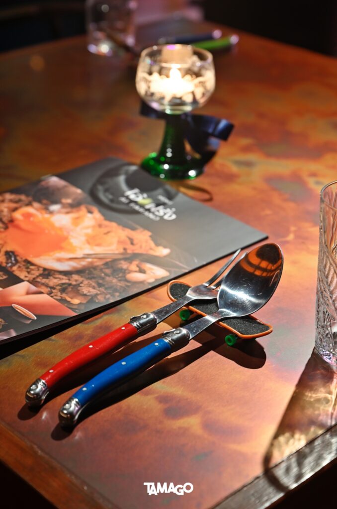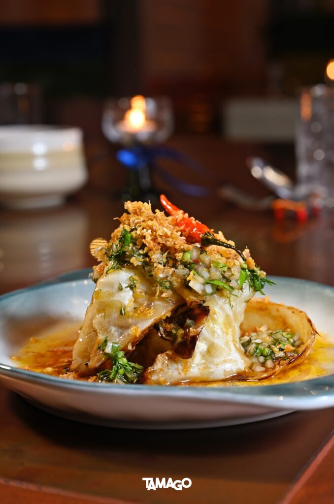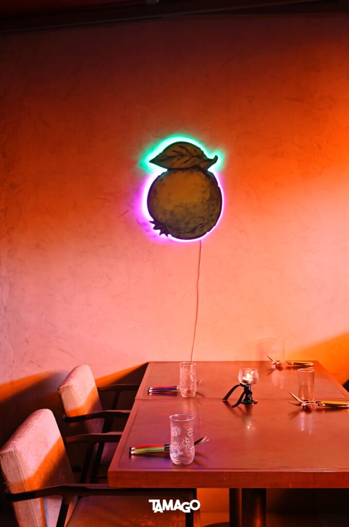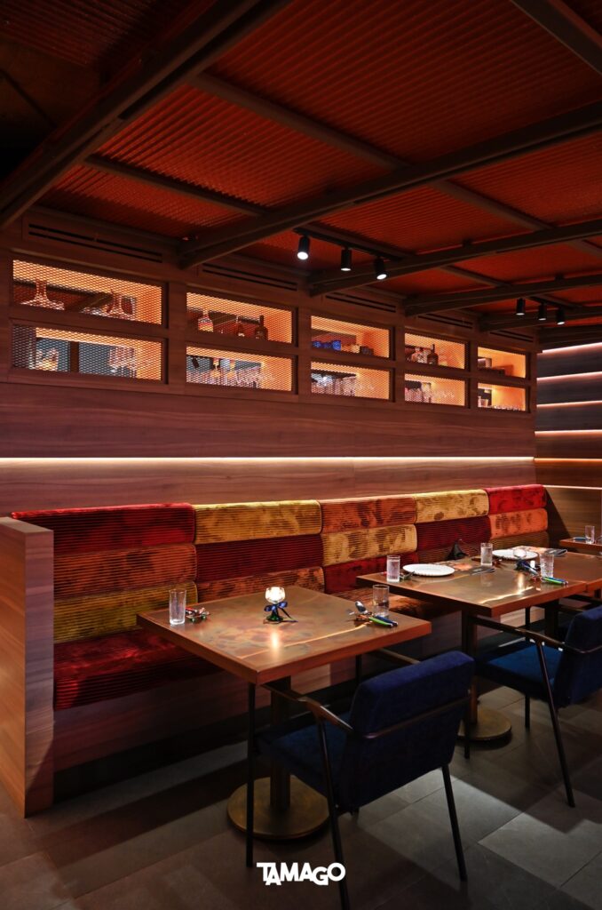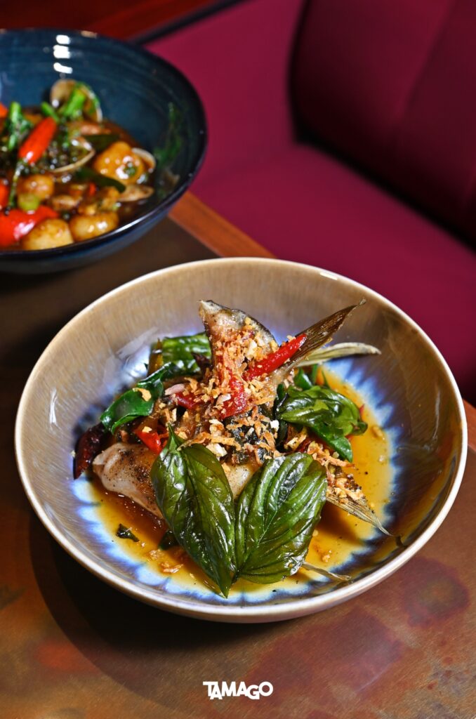 บรรยากาศของร้านหยิบศาลาไทยริมน้ำเข้ามาผสานกับความร่วมสมัยในสไตล์ดิบเท่ โดดเด่นด้วย 3 เฉดสี ที่สะท้อนภูมิทัศน์ของประเทศไทย อาทิ สีส้มที่ได้แรงบันดาลใจจากแสงอาทิตย์ยามเย็นของเกาะพะงัน, สีเขียวที่สะท้อนโทนป่าของเชียงใหม่ และสีน้ำเงินที่ชวนให้นึกถึงท้องทะเลลึกทางใต้ของไทย ใส่ใจรายละเอียดไปจนถึงเฟอร์นิเจอร์ และของสะสมที่ให้กลิ่นอายยุค 60s–70s ทั้งยังคลอไปด้วยเพลงไทยที่เรียกได้ว่า ‘ปีลึก’ ของจริง ที่ช่วยเติมอารมณ์ให้มื้ออาหาร