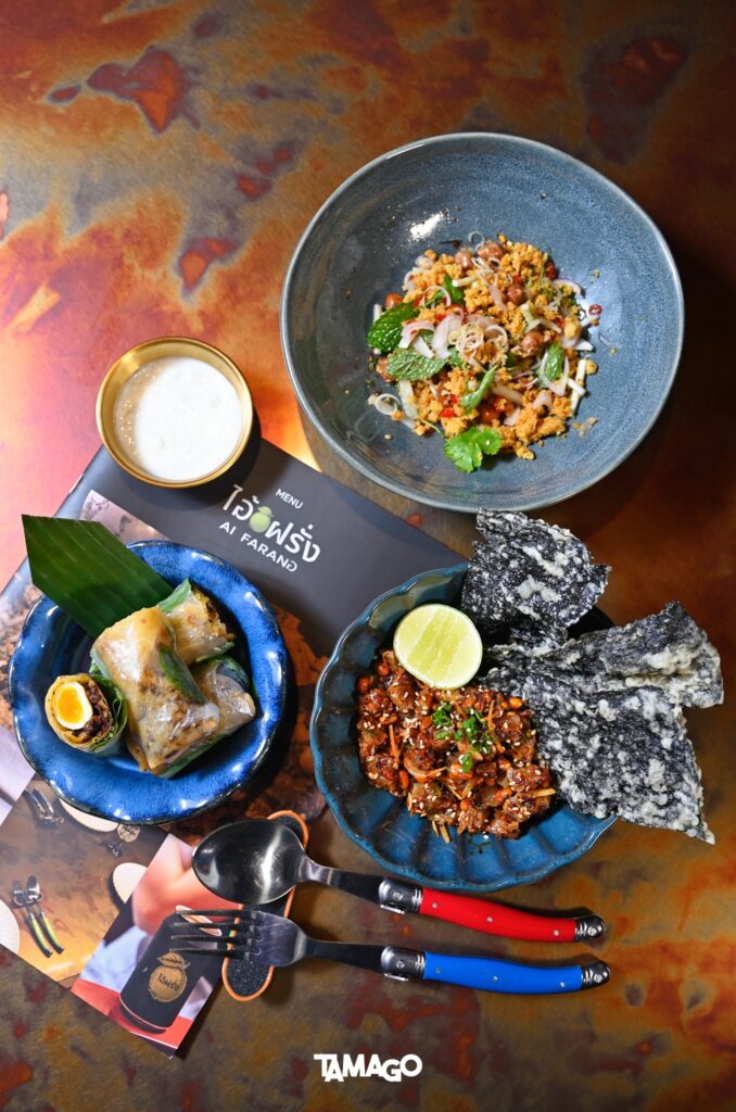 เมนูของไอ้ฝรั่งเต็มไปด้วยความสร้างสรรค์ที่ไร้กรอบ ขี้เล่น ท้าทายกฎเกณฑ์ และถ้าไม่รู้ว่าจะเริ่มตรงไหน ขอแนะนำให้เปิดมื้อด้วยจานเรียกน้ำย่อยอย่าง Pad Krapao Spring Rolls ปอเปี๊ยะกะเพราเนื้อ เสิร์ฟคู่กับซอสการ์ลิคไลม์ซาวร์ครีม, Katsuo Tuna Poke Nam โปเก ทูน่าคัตสึโอะ คลุกเคล้าน้ำพริกเผา ทานคู่สาหร่ายกรอบ, Yum “Fried Chicken” Foo ยำไก่ฟูคลุกน้ำยำรสจัดจ้าน