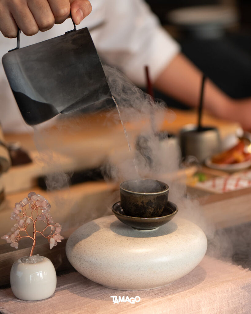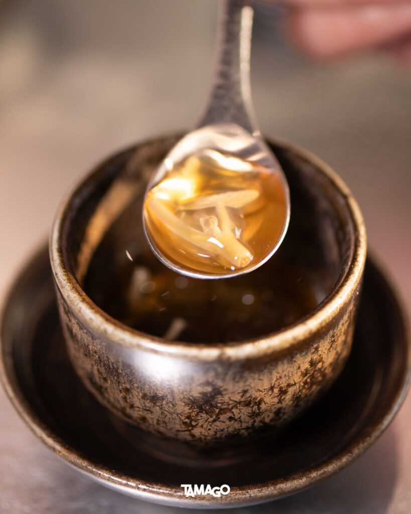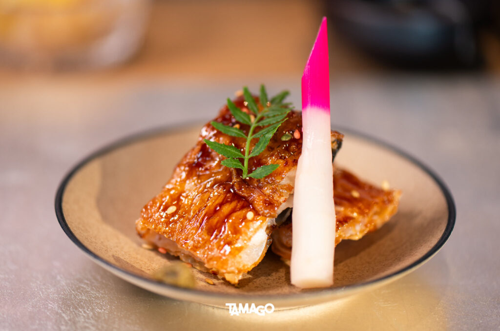 ต่อด้วย Sawanmushi ไข่ตุ๋นญี่ปุ่นอุ่นๆ ที่เต็มไปด้วยความอูมามิกับความหวานจากเนื้อปู และ Unagi Yaki ปลาไหลญี่ปุ่นเนื้อนุ่มฟู มาพร้อมกับเทคนิคย่างหนังกรอบคริสปี้ด้วยไฟอ่อน สร้างสัมผัสแตกต่างในชิ้นเดียว จบจากอีกหนึ่งจานร้อน ก็ตามด้วย Mozuku Junsai สาหร่ายโมซูกุกับยอดอ่อนจุนไซในเจลลี่รสเปรี้ยว เย็นสดชื่น