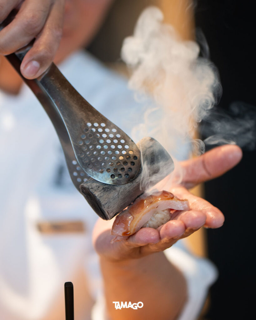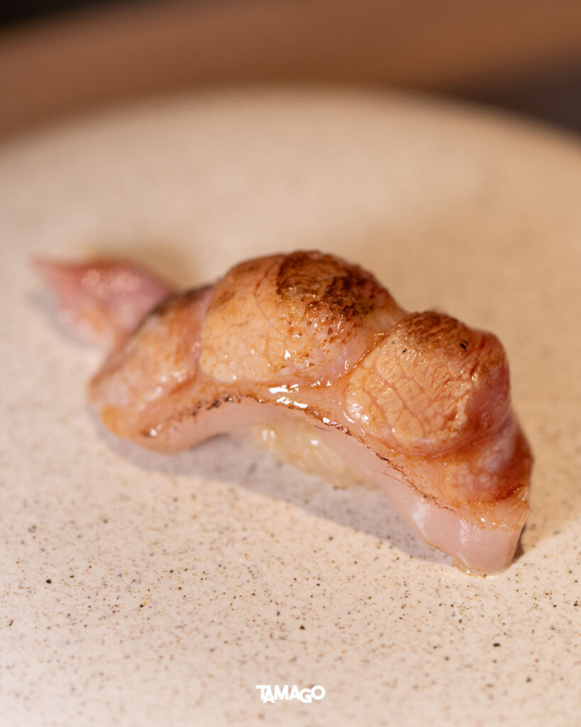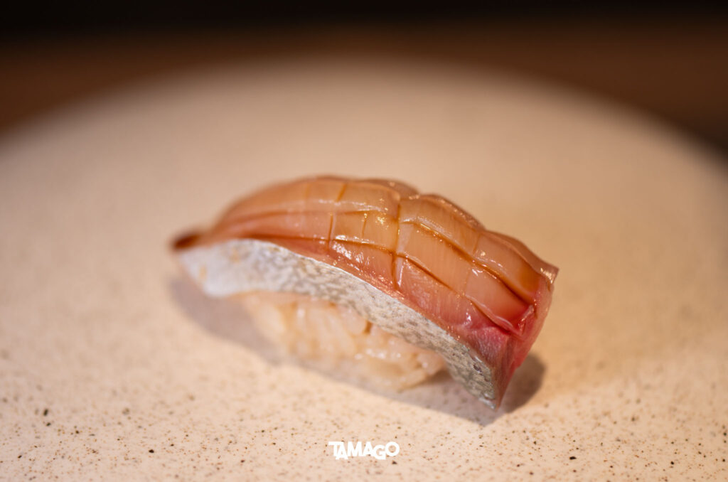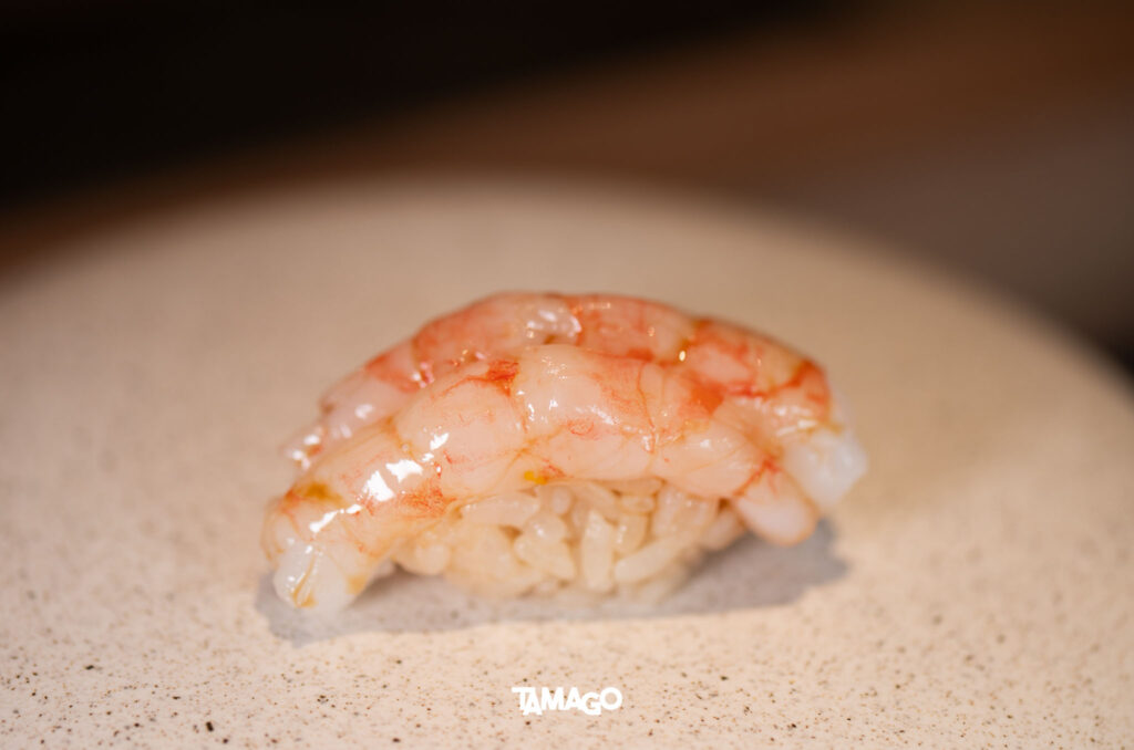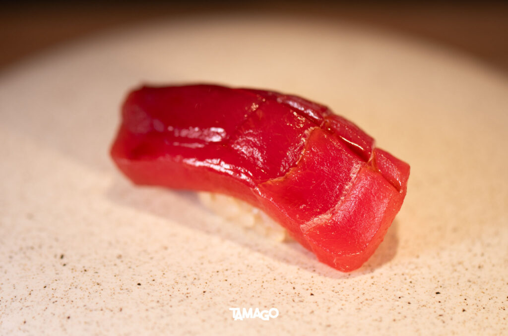 คำแรกเป็นปลาเนื้อขาวมาได Madai ตามด้วย Shima Aji ของดีประจำฤดูร้อน เป็นปลาเนื้อขาวสัมผัสแน่นกรอบ และ Ama Ebi กุ้งหวานตัวโต สดหวานธรรมชาติตามชื่อ ก่อนเข้าสู่โซนฮงมากุโระหรือปลาทูน่า เริ่มจาก Akami ส่วนเนื้อแดงที่ไม่มีไขมัน แล้วจึงจะไต่ระดับความเข้มข้นไปยังเนื้อปลาส่วนอื่นๆ