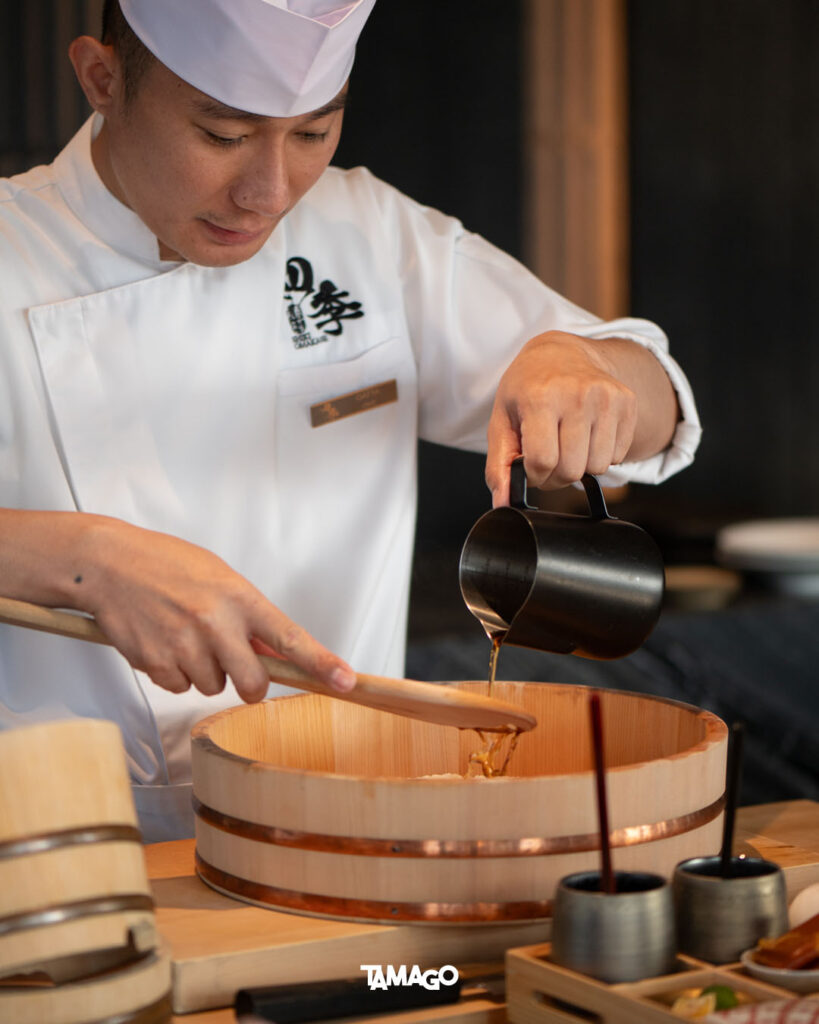 สำหรับเมนูนิกิริและเทมากิที่จะเสิร์ฟต่อไป เชฟจะเตรียมข้าวซูชิสดใหม่ให้เห็นตรงหน้า คลุกเคล้าข้าวญี่ปุ่นกับน้ำส้มสายชูแดงแล้วพักไว้ ซึ่งเทคนิคการปั้นของที่นี่ก็ไม่เหมือนใคร โดยปั้นข้าวให้เกาะกลุ่มกันแต่ไม่อัดแน่นจนเกินไป ยังสัมผัสได้ถึงข้าวที่ร่วนเป็นเม็ด เรียกได้ว่าพิถีพิถันทั้งข้าวซูซิและอาหารทะเล