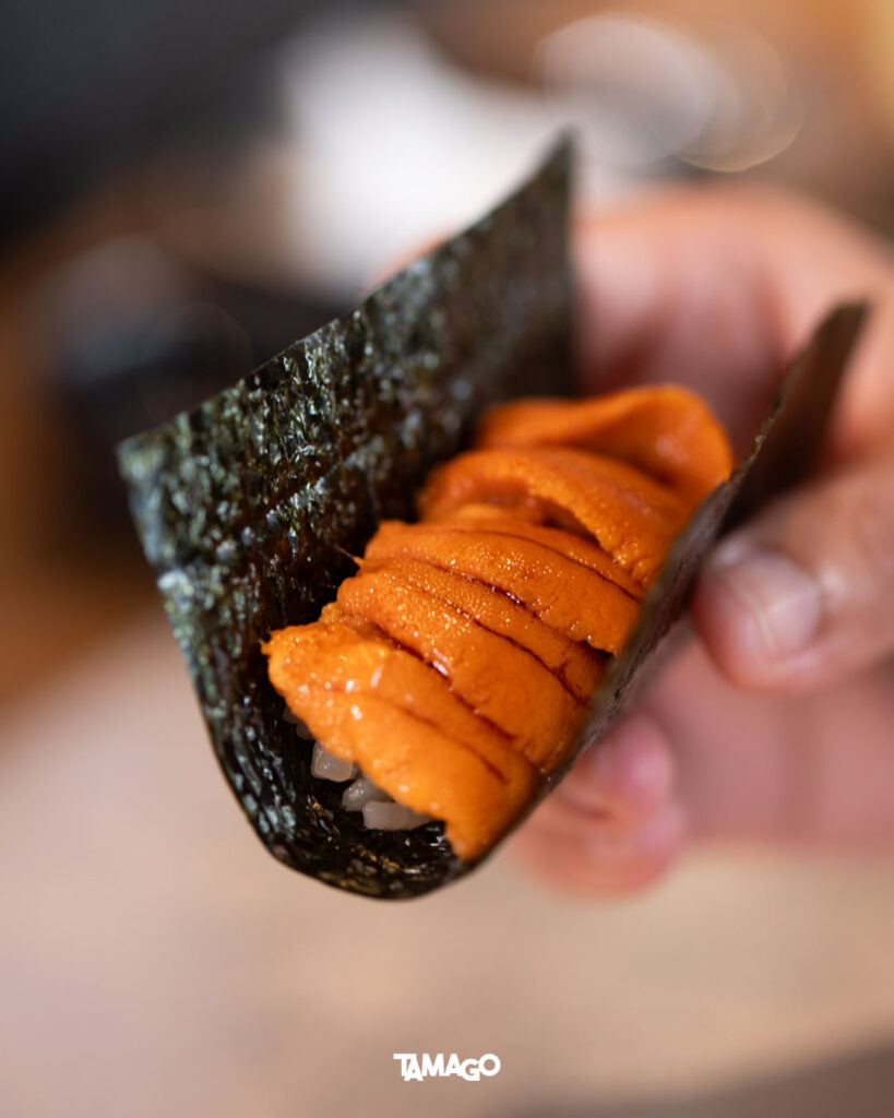 คำถัดมาเป็น Otoro ส่วนท้องปลาที่มีไขมันแทรกมากที่สุด เนื้อนุ่มหวาน ทางร้านจะเผาผิวปลาให้กรอบขึ้นเล็กน้อยด้วยถ่านไม้บินโจตัน ซึ่งเพิ่มรสชาติให้ไขมันหอมหวานยิ่งขึ้นด้วย ความเข้มข้นยังไม่สิ้นสุด Uni Temaki และต้องเป็นอูนิบะฟุนจากการคัดสรรของเชฟเท่านั้น! จะได้ลิ้มรสความอูมามิธรรมชาติเต็มที่ หอมมันกลมกล่อม เรียกได้ว่าเป็นจุดพีคของคอร์สนี้เลยทีเดียว