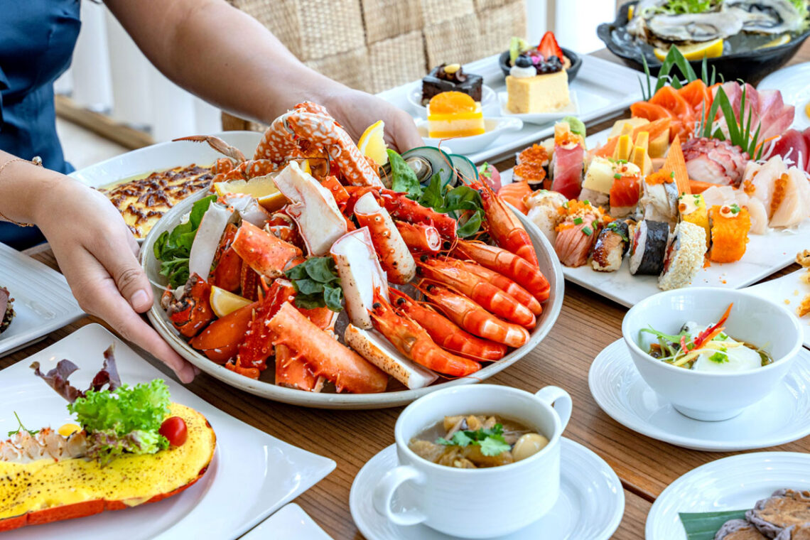 อิ่มอร่อยกับหลากหลายเมนูระดับพรีเมียม อาทิ ปูคิงแครบ ปูม้า ปูทะเล หอยนางรมเกาหลี ซูชิ ซาชิมิ (หอยปีกนก ปลาฮามาจิ ปลาทูน่า ปลาแซลมอน) อาหารไทยรสจัดจ้าน และอาหารตะวันตก พร้อมเลือกรับล็อบสเตอร์อบชีส (ครึ่งตัวต่อท่าน) หรือ Surf & Turf เนื้อวากิวและปลาแซลมอน ปิดท้ายมื้อด้วยของหวานสุดพรีเมียม ทั้งไอศกรีม Häagen-Dazs, ข้าวเหนียวมะม่วง, และเบเกอรี่หลากหลายแบบโฮมเมดที่จัดเต็มให้เลือกอร่อยไม่อั้น