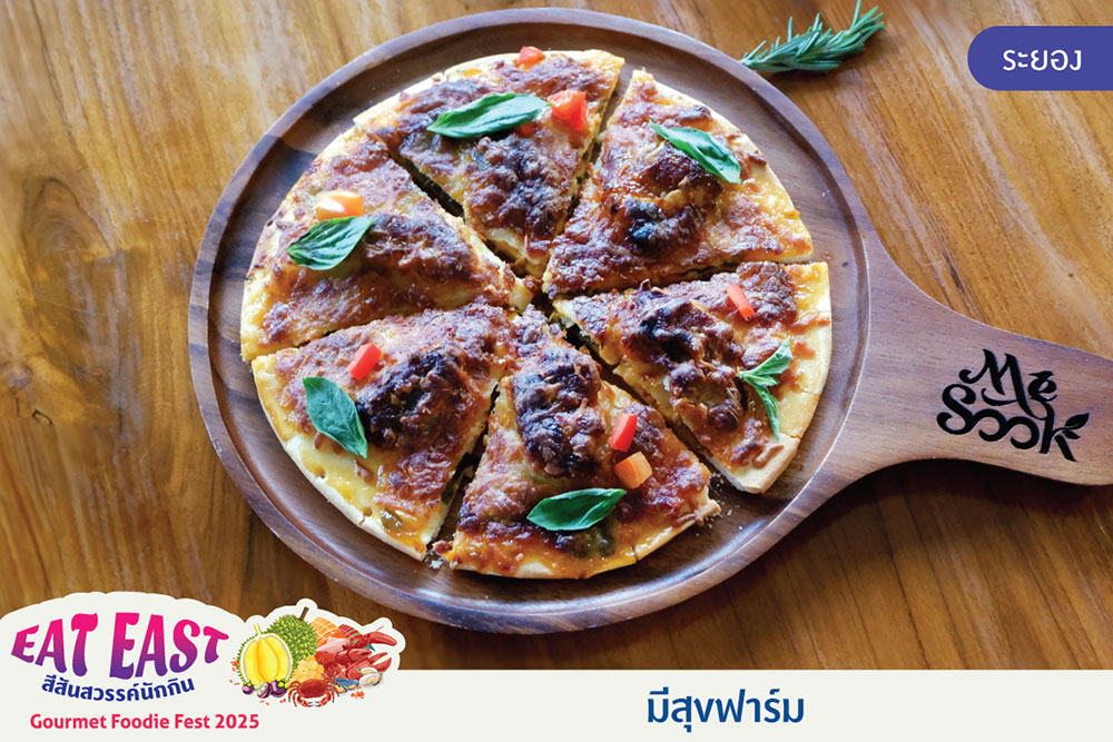 • มีสุขฟาร์ม คาเฟ่ พิซซ่าหน้าหมูชะมวง เนื้อหมูคัดสรรอย่างดี รสชาติเปรี้ยวอมหวาน วางบนแผ่นพิซซ่าหนานุ่ม เป็นหนึ่งในเมนูที่หาชิมได้ที่เดียวในไทย