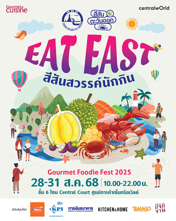 เตรียมพบที่สุดแห่งความอร่อยจากดินแดนตะวันออก ที่รวมทั้งรสชาติและเสน่ห์วัฒนธรรมการกินไว้ในงานเดียว! นิตยสาร Gourmet & Cuisine ร่วมกับ การท่องเที่ยวแห่งประเทศไทย (ททท.) ภูมิภาคตะวันออก จัดงาน “Gourmet Foodie Fest 2025 : Eat East-สีสันสวรรค์นักกิน” เทศกาลอาหารที่รวบรวมเอกลักษณ์แห่งรสชาติและวัฒนธรรมการกินของภาคตะวันออก ยกทัพกว่า 25 ร้านเด็ด จากภาคตะวันออก มาเสิร์ฟใจกลางกรุงเทพฯ ให้เหล่าฟู้ดดี้ได้ลิ้มลองความอร่อยแบบต้นตำรับ ครบเครื่องทั้งอาหารทะเลสดใหม่ระดับพรีเมียม อาหารพื้นถิ่นหากินยาก เครื่องดื่มสูตรพิเศษ และของหวานไอเดียสร้างสรรค์ พร้อมกิจกรรมพิเศษจากดาราและอินฟลู เอนเซอร์สายกินชื่อดัง ที่จะมาเติมสีสัน แชร์เคล็ดลับ และสร้างบรรยากาศสนุก อร่อย มีเรื่องเล่า วันที่ 28-31 สิงหาคม 2568 เวลา 10.00-22.00 น. ณ โซน Central Court ชั้น 6 ศูนย์การค้าเซ็นทรัลเวิลด์