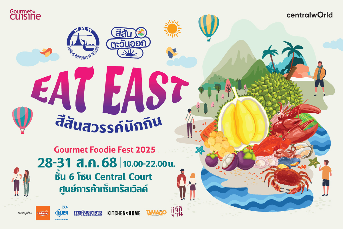 เตรียมพบที่สุดแห่งความอร่อยจากดินแดนตะวันออก ที่รวมทั้งรสชาติและเสน่ห์วัฒนธรรมการกินไว้ในงานเดียว! นิตยสาร Gourmet & Cuisine ร่วมกับ การท่องเที่ยวแห่งประเทศไทย (ททท.) ภูมิภาคตะวันออก จัดงาน “Gourmet Foodie Fest 2025 : Eat East-สีสันสวรรค์นักกิน” เทศกาลอาหารที่รวบรวมเอกลักษณ์แห่งรสชาติและวัฒนธรรมการกินของภาคตะวันออก ยกทัพกว่า 25 ร้านเด็ด จากภาคตะวันออก มาเสิร์ฟใจกลางกรุงเทพฯ ให้เหล่าฟู้ดดี้ได้ลิ้มลองความอร่อยแบบต้นตำรับ ครบเครื่องทั้งอาหารทะเลสดใหม่ระดับพรีเมียม อาหารพื้นถิ่นหากินยาก เครื่องดื่มสูตรพิเศษ และของหวานไอเดียสร้างสรรค์ พร้อมกิจกรรมพิเศษจากดาราและอินฟลู เอนเซอร์สายกินชื่อดัง ที่จะมาเติมสีสัน แชร์เคล็ดลับ และสร้างบรรยากาศสนุก อร่อย มีเรื่องเล่า วันที่ 28-31 สิงหาคม 2568 เวลา 10.00-22.00 น. ณ โซน Central Court ชั้น 6 ศูนย์การค้าเซ็นทรัลเวิลด์