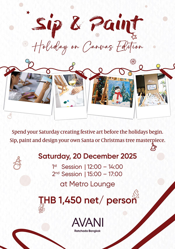 ท่ามกลางโลกที่เร่งรีบและเต็มไปด้วยความวุ่นวาย โรงแรมอวานี รัชดา กรุงเทพฯ (Avani Ratchada Bangkok) ชวนทุกท่านหยุดพักจากความวุ่นวาย แล้วกลับมาสัมผัสช่วงเวลาแห่งความสงบและตัวตนของคุณ ที่ เมโทร เลานจ์ (Metro Lounge) พื้นที่แห่งความสร้างสรรค์ใจกลางเมือง ซึ่งตลอดทั้งปีได้จัดกิจกรรมเวิร์กช็อปแฮนด์เมดมากมาย ตั้งแต่การจัดดอกไม้ ทำสวนในขวดแก้ว เพนต์มันดาลา ไปจนถึงคลาสศิลปะบนผ้าใบ ทุกกิจกรรมมอบโอกาสให้ผู้เข้าร่วมได้ผ่อนคลาย มีสมาธิกับสิ่งตรงหน้า และกลับมามีความสุขกับช่วงเวลาปัจจุบัน