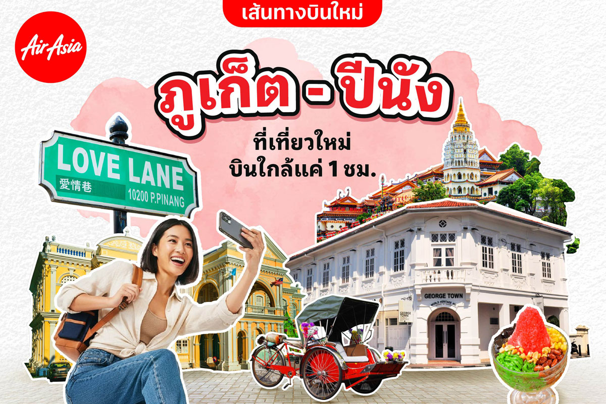 แอร์เอเชีย มาเลเซีย (รหัสเที่ยวบิน AK) เปิดเส้นทางเชื่อมโยงอาเซียนเส้นทางบินใหม่ล่าสุด ภูเก็ต-ปีนัง พร้อมให้บริการ 4 เที่ยวบินต่อสัปดาห์ (จันทร์-พุธ-ศุกร์-อาทิตย์) เริ่มเที่ยวบินแรกตั้งแต่วันที่ 13 มีนาคม 2569