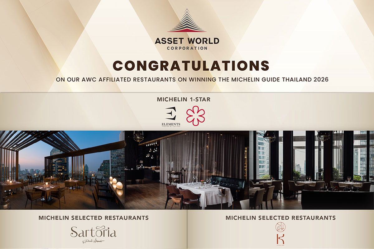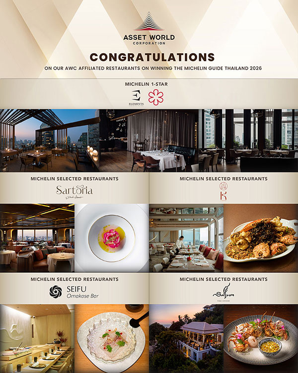 บริษัท แอสเสท เวิรด์ คอร์ป จำกัด (มหาชน) (AWC) รู้สึกเป็นเกียรติและภาคภูมิใจอย่างยิ่งที่ร้านอาหารและโรงแรมในเครือได้รับการคัดเลือกและจัดอันดับใน MICHELIN Guide Thailand 2026 ความสำเร็จครั้งนี้สะท้อนถึงความมุ่งมั่นอย่างต่อเนื่องในการส่งมอบคุณภาพอาหารและการบริการระดับโลก ควบคู่กับการสร้างประสบการณ์การท่องเที่ยวที่มีคุณค่าและยั่งยืนให้กับประเทศไทย