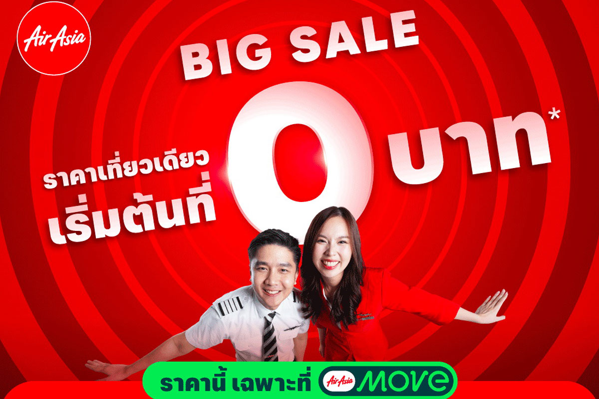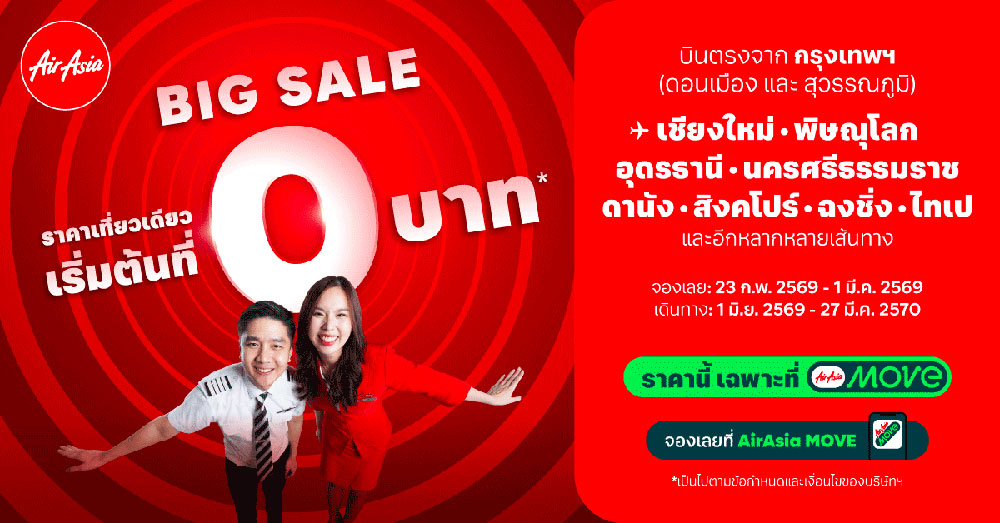 แอร์เอเชียประเดิมต้นปีด้วยแคมเปญโปรโมชั่นที่ใหญ่ที่สุด “BIG SALE” คุ้มค่าด้วยบัตรโดยสารราคาเที่ยวเดียว เริ่มต้นที่ 0 บาทต่อเที่ยว* ครอบคลุมเครือข่ายเส้นทางบินที่หลากหลาย วางแผนการเดินทางล่วงหน้าแล้วจองเลย  สำรองที่นั่งได้ตั้งแต่วันนี้ ถึงวันที่ 1 มีนาคม 2569 เพื่อเดินทางได้ตั้งแต่วันที่ 1 มิถุนายน 2569 – 27 มีนาคม 2570 ผ่านทางแอปพลิเคชั่น AirAsia MOVE และเว็บไซต์ airasia.com แล้วไปสัมผัสประสบการณ์การเดินทางสุดคุ้มกันได้เลย!